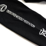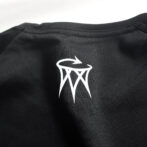 ブラックの身頃に右袖、前左裾、後ろ衿部分にホワイトのプリント。